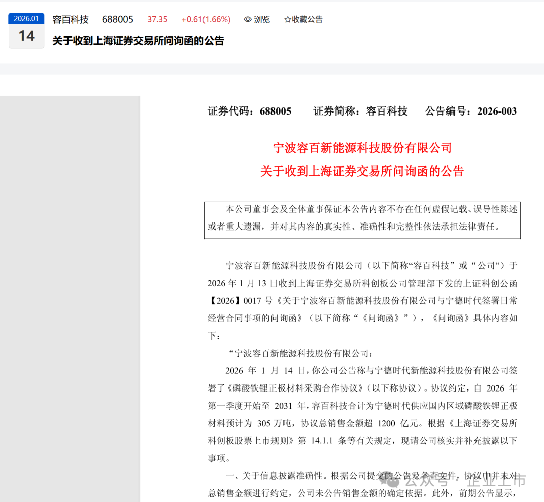 2026年1月,宁波容百新能源科技股份有限公司(容百科技,688005.SH)因一份涉及金额超1200亿元的“日常经营重大合同”公告,因信息披露不准确、不完整,涉嫌误导性陈述,被上海证券交易所火速问询,并最终收到中国证券监督管理委员会的立案告知书。