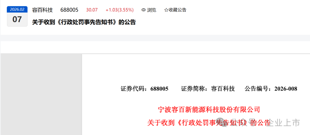 2026年2月7日,容百科技(维权)发布公告,称收到宁波证监局《行政处罚事先告知书》,因公司与宁德时代重大合同公告涉嫌误导性陈述,将被处以合计950万元的罚款。