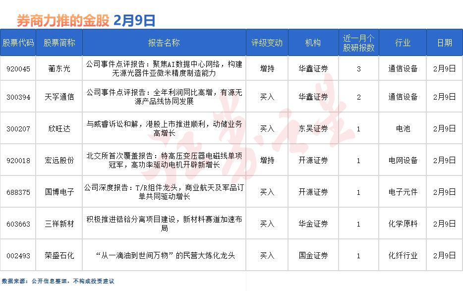 2月9日又有华鑫证券发布研报《公司事件点评报告:聚焦AI数据中心网络,构建无源光器件亚微米精度制造能力》,认为公司深度布局AI数据中心网络的光纤连接产业链以及无源光器件,有望受益于AI算力需求高速增长、数据中心建设进程加速的积极影响,订单数量和客户数量不断上升,首次覆盖,给予“增持”投资评级。