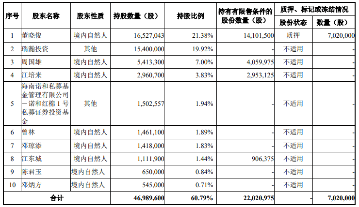 截至2025年9月30日,董晓俊先生直接持有公司股份16,527,043股,占公司股本总额的21.38%;通过持有瑞瀚投资53.72%的合伙份额并任其执行事务合伙人间接持有公司10.70%股权。董晓俊先生直接和间接合计持有公司32.08%的股权,为公司的控股股东、实际控制人。