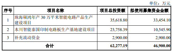 此次再融资拟募集4.69亿元,用于珠海硕鸿年产30万平米智能电路产品生产建设项目、本川智能泰国印制电路板生产基地建设项目、补充流动资金。