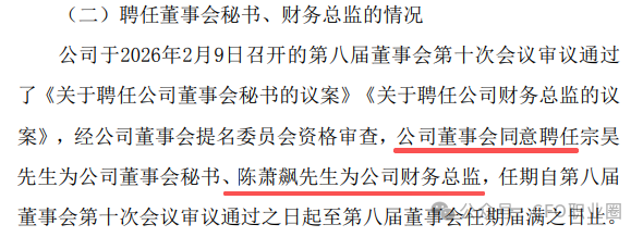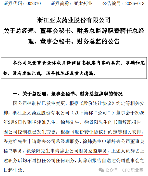 2026年2月10日,深交所主板上市公司亚太药业(002370.SZ)发布的公告显示,因公司控制权已发生变更,根据《股份转让协议》约定等相关安排,徐景阳先生申请辞去公司财务总监职务。公司董事会同意聘任陈萧飙先生为公司财务总监。