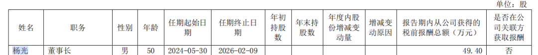2月10日,中国医药董事会选举杨光担任董事长、总经理一职。杨光此次是继任董事长,2024年其作为董事长从公司获得的税前报酬总额为49.40万元。