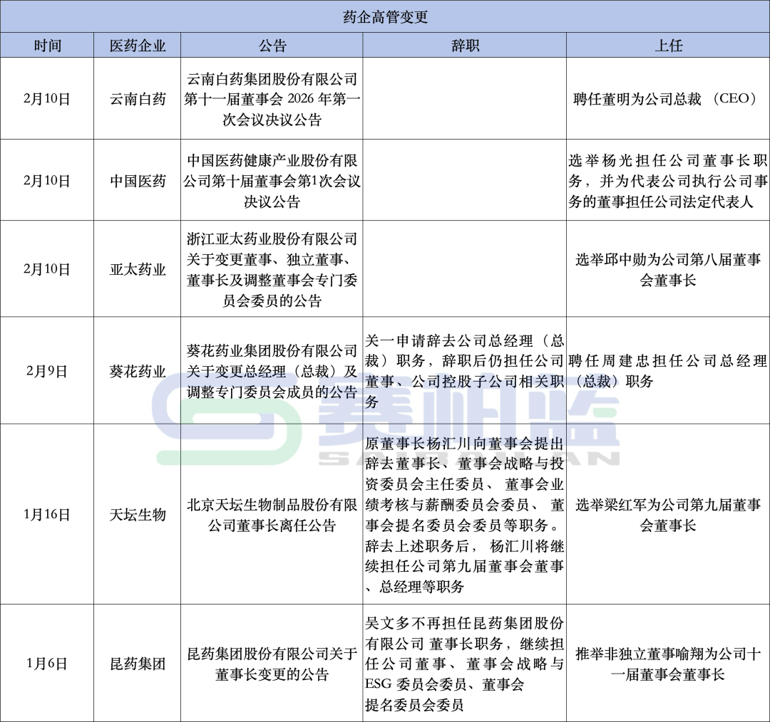 据赛柏蓝不完全统计,2026年以来医药行业已有至少6家企业的董事长、总经理、总裁等核心管理岗位完成高管调整。