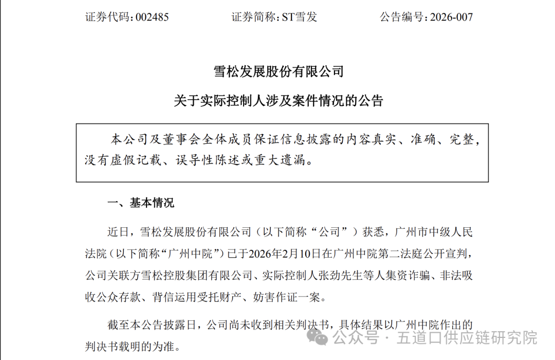 2月10日晚,ST雪发(002485.SZ)公告称,广州市中级人民法院已于当日公开宣判,公司关联方雪松控股、实际控制人张劲等人集资诈骗、非法吸收公众存款、背信运用受托财产、妨害作证一案。