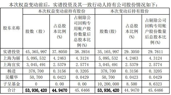 简式权益变动报告书透露,公司实际控制人为杨进、吴耀华夫妇。杨进直接持有实谱投资66%股权,吴耀华直接持有实谱投资20%股权,杨进直接持有上海宜实96.08%股权,吴耀华直接持有上海为丽68.96%股权。杨进、吴耀华夫妇通过实谱投资、上海宜实、上海为丽间接持有公司股权,对公司形成共同控制。