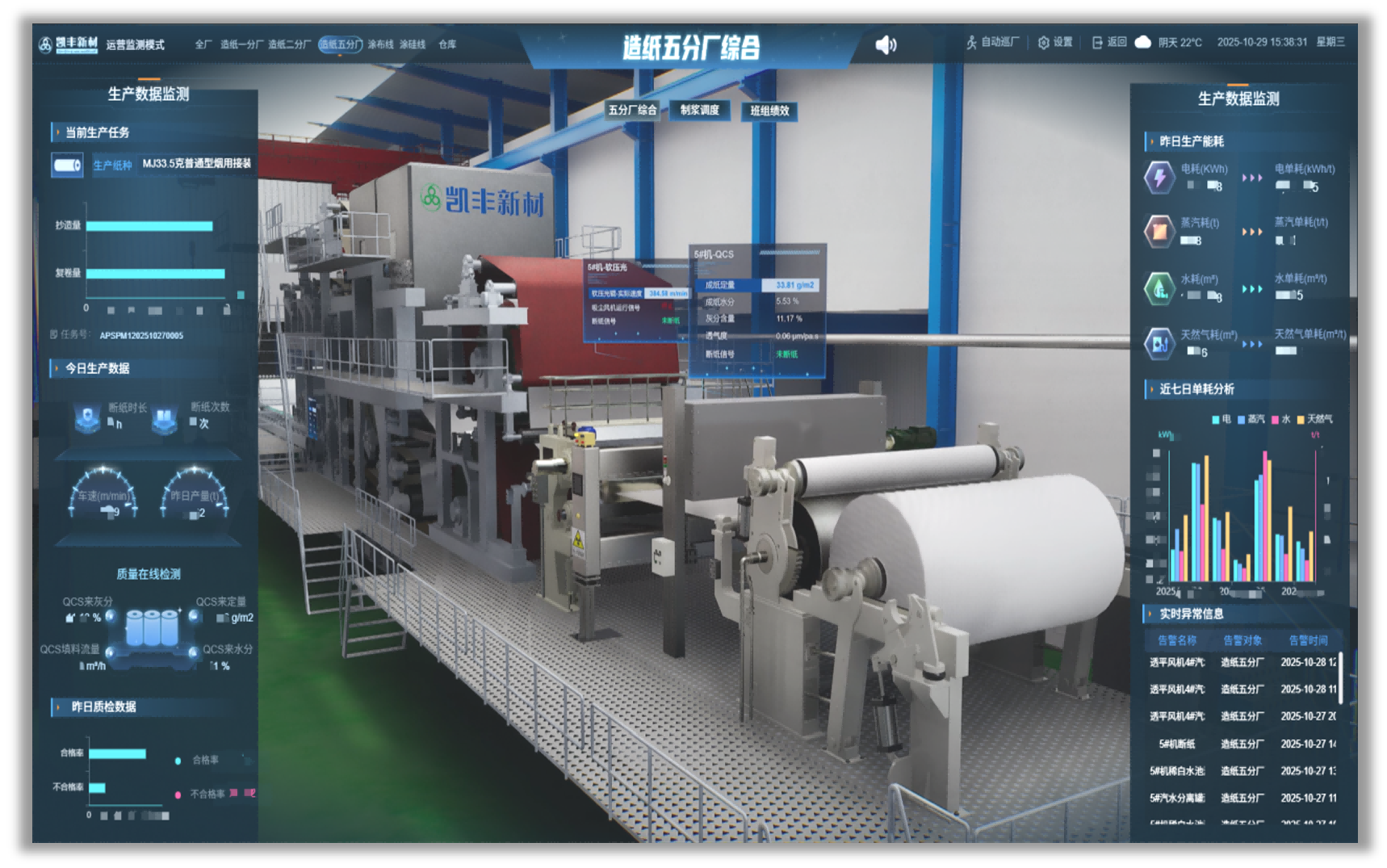 当前,国内多数特种纸企业仍处于数字化转型初期,公司已全面完成数字化转型三期项目。公司数字化转型一期项目成功打通生产端所有业务数据,二期项目实现全链路智能化协同,三期实现数字孪生、虚拟现实交互,以系统的高度集成与协同,通过MOM+平台打通APS、MES、QMS、WMS及EMS等系统,实现了从订单到交付的全链条数据闭环管理。