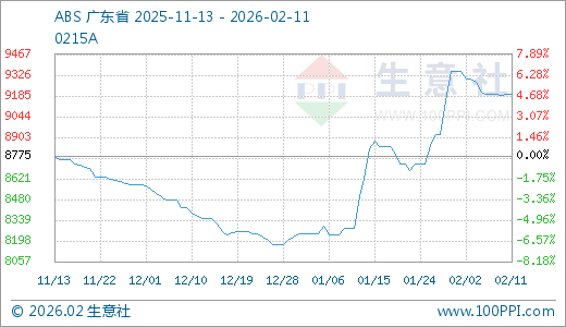 据生意社监测,ABS 02月11日最新价格9193.33元/吨,最近60天上涨10.10%。