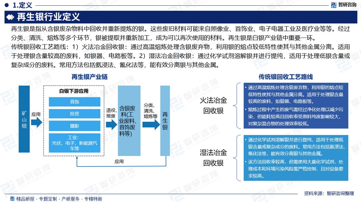 定义:再生银是指从含银废杂物料中回收并重新提炼的银。这些废旧材料可能来自照像业、首饰业、电子电器工业及医疗业等等。经过分类、清洗、熔炼等多个环节,银被提取并重新加工,成为可以再次使用的材料。再生银是白银产业链中重要一环。