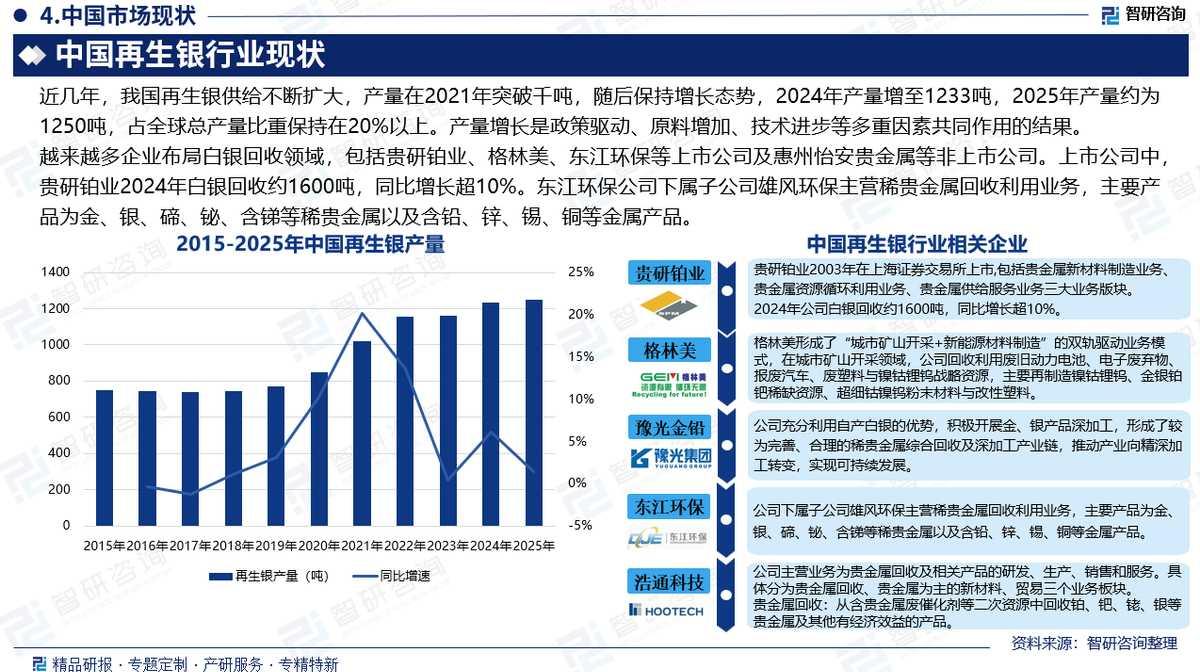 中国供给规模:近几年,我国再生银供给不断扩大,产量在2021年突破千吨,随后保持增长态势,2024年产量增至1233吨,2025年产量约为1250吨,占全球总产量比重保持在20%以上。产量增长是政策驱动、原料增加、技术进步等多重因素共同作用的结果。
