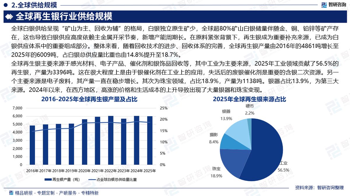 再生银是指从含银废杂物料中回收并重新提炼的银。这些废旧材料可能来自照像业、首饰业、电子电器工业及医疗业等等。经过分类、清洗、熔炼等多个环节,银被提取并重新加工,成为可以再次使用的材料。再生银是白银产业链中重要一环。全球白银供给呈现“矿山为主、回收为辅”的格局,白银独立原生矿少,全球超80%矿山白银储量伴随金、铜、铅锌等矿产存在,这也导致白银供应高度依赖主金属开采节奏,新增产能周期长。在原料紧张背景下,再生银成为重要补充来源,已成为白银供应体系中的重要组成部分。整体来看,随着回收技术的进步、回收体系的完善,全球再生银产量由2016年的4861吨增长至2025年的6009吨,占白银总供应量比重也由14.8%提升至18.7%。2024年全球再生银行业产量前五国家分别为美国、中国、印度、德国、俄罗斯,产量分别为1572吨、1233吨、533吨、377吨、332吨。中美两国拥有庞大的工业体系,既是白银消费主要国,也是白银回收大国,不仅产量位居全球前列,回收技术也处于行业先进水平。印度作为银饰大国,再生银产量位居第三。全球再生银主要来源于感光材料、电子产品、催化剂和银饰品回收等,其中工业为主要来源,2025年工业领域贡献了56.5%的再生银,产量为3396吨。其次为珠宝领域,占比18.9%,产量为1138吨。银器占比13.9%,为第三大来源。近几年,中国再生银供给不断扩大,产量在2021年突破千吨,随后保持增长态势,2024年产量增至1233吨,2025年产量约为1250吨,占全球总产量比重保持在20%以上。产量增长是政策驱动、原料增加、技术进步等多重因素共同作用的结果,一方面,政策支持力度不断加大,为再生银行业创造了良好的发展环境;另一方面,电子废弃物等含银废料不断增加,为行业提供了丰富原料。此外,回收工艺的进步也是推动规模扩张的重要因素。