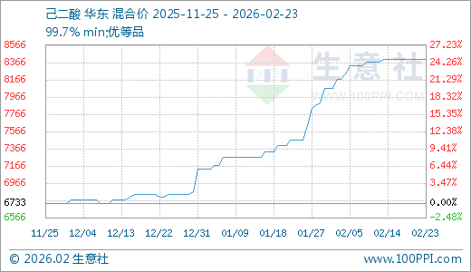 据生意社监测,己二酸02月23日最新价格8400.00元/吨,最近30天上涨12.50%,60天上涨22.93%。