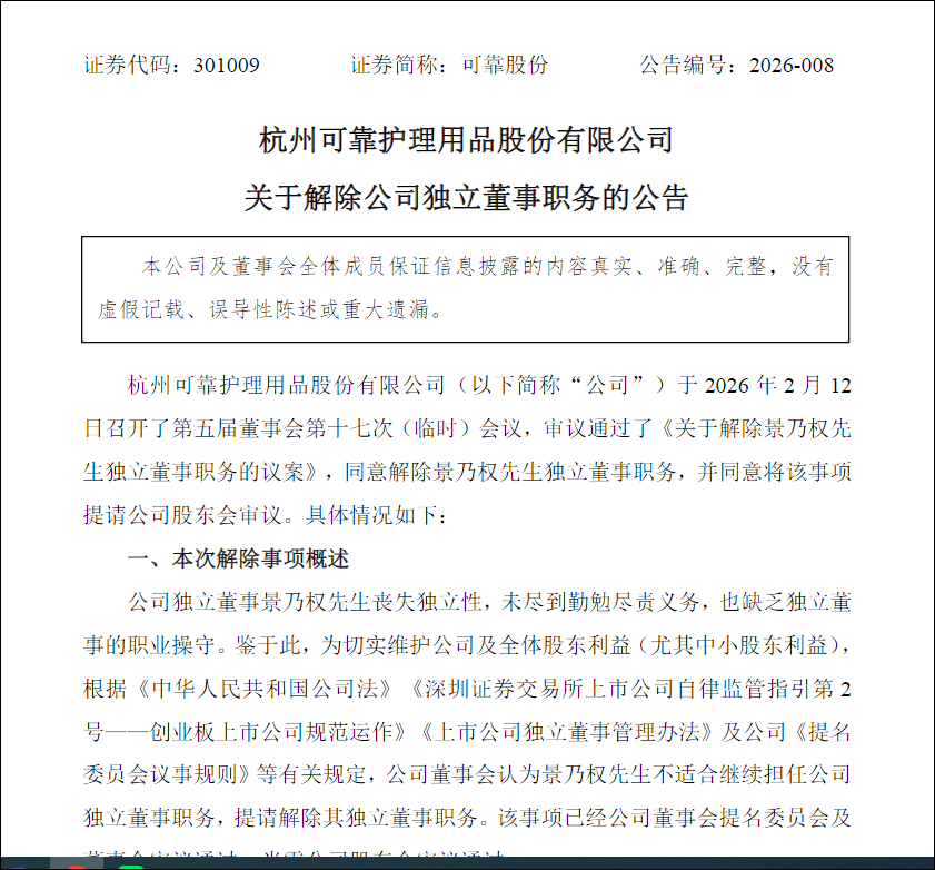 在《关于解除公司独立董事职务的公告》中,可靠股份董事会认为,景乃权不适合继续担任公司独立董事职务,提请解除其独立董事职务。该事项已经公司董事会提名委员会及董事会审议通过,尚需公司股东会审议通过。