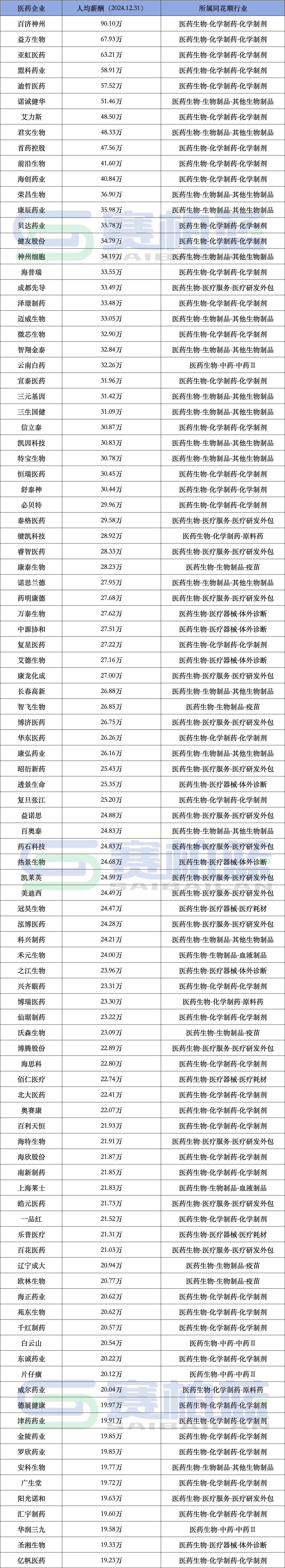 化学制药企业稳居人均薪酬前排。