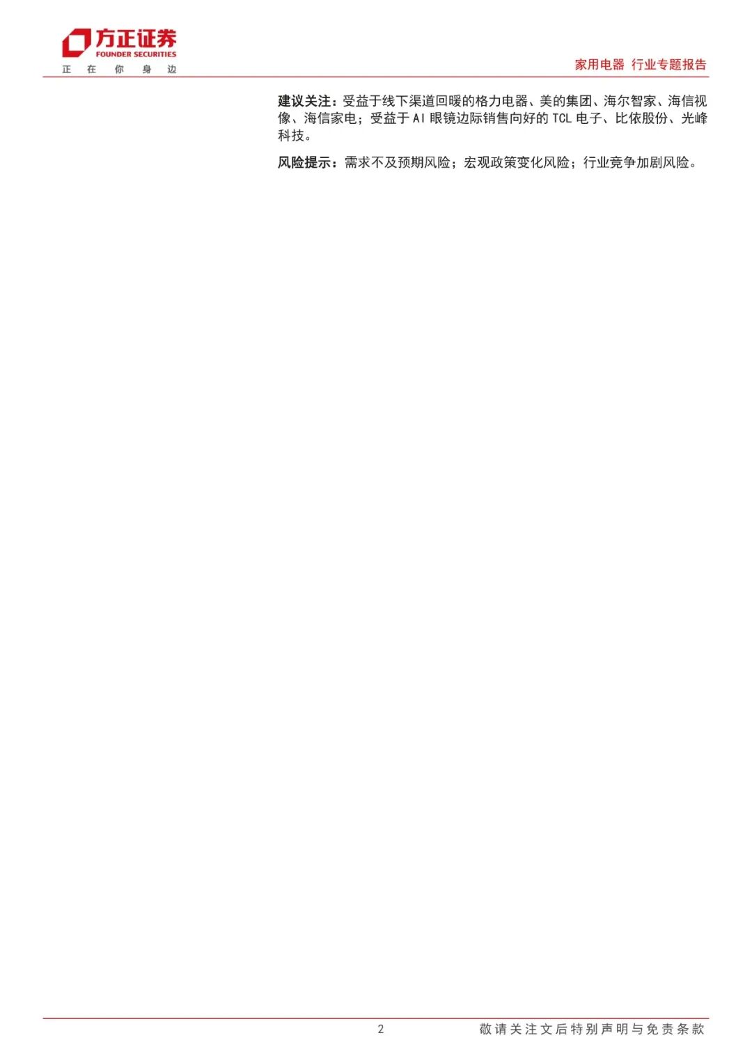 建议关注:受益于线下渠道回暖的格力电器、美的集团、海尔智家、海信视像、海信家电;受益于AI眼镜边际销售向好的TCL电子、比依股份、光峰科技。