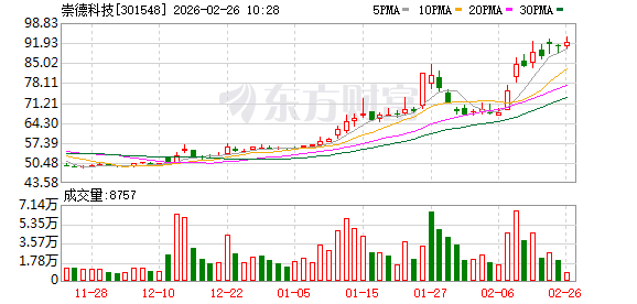 证券时报·数据宝统计,截至发稿,崇德科技最新股价为90.65元,下跌0.18%,本期筹码集中以来股价累计上涨7.37%。具体到各交易日,2次上涨,4次下跌。