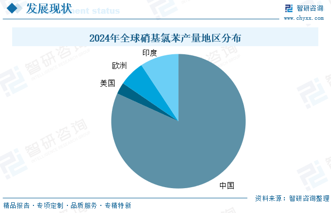 硝基氯苯供应高度集中,中国为硝基氯苯最大生产国,2024年贡献了全球约82%的产量;印度也是硝基氯苯的生产大国,2024年其产量占比约9%;美国硝基氯苯产业受环保、成本以及我国硝基氯苯强大竞争压力等因素的影响,其产能、产量均处于较低水平。
