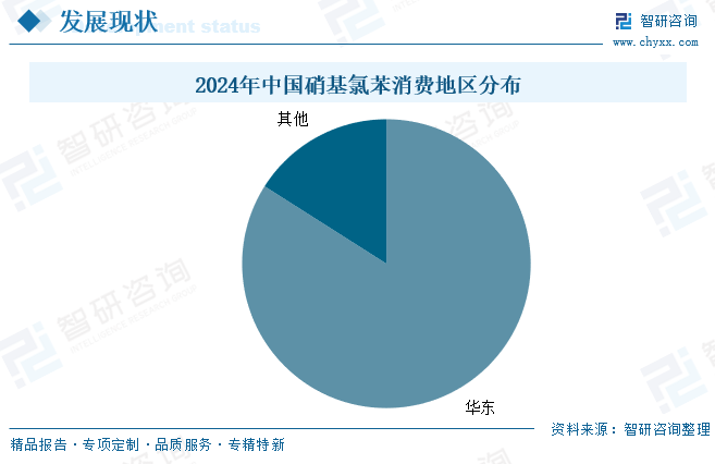 从区域分布来看,我国硝基氯苯的需求大部分都集中在华东地区。这是因为:一方面,国内硝基氯苯产能主要分布在华东,且这些企业的硝基氯苯以自用为主;另一方面,华东地区农药、医药、染料等产业规模较大,硝基氯苯的用量比较大。