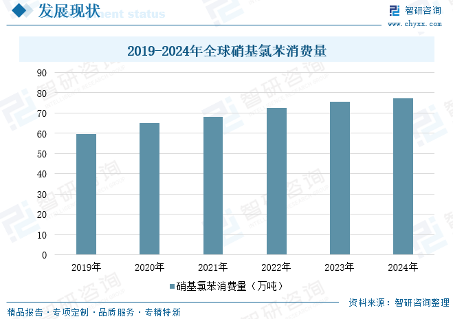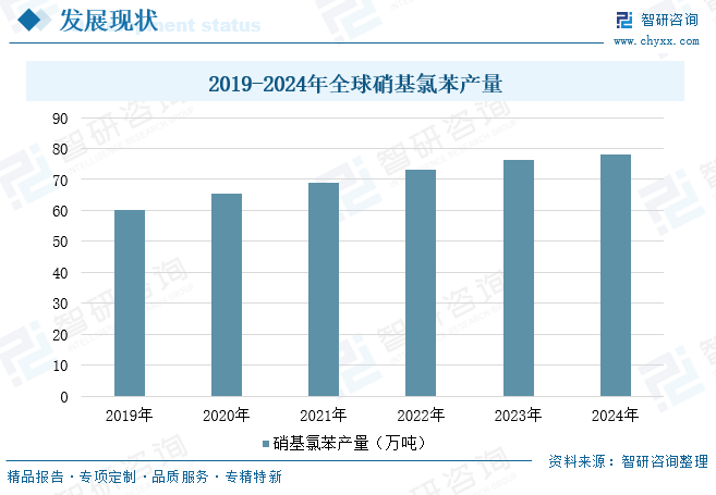 硝基氯苯是重要的化工原料和中间体,在多个领域有着重要应用,全球硝基氯苯产能已超110万吨。近年来,受下游需求的推动。全球硝基氯苯产量呈持续增长态势,由2019年的60.3万吨增长至2024年的77.9万吨,实现年复合增长率5.3%。