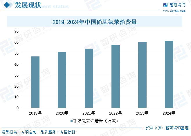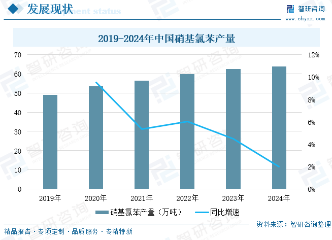 我国在全球硝基氯苯市场中占据主导地位,近几年产量稳步增长,2024年中国硝基氯苯产量为63.8万吨,同比增长2%;这一方面受益于我国具有完善的相关产业链,为庞大的硝基氯苯生产规模提供了广阔的上游及下游市场。另一方面,我国凭借其高素质的人力资源以及不断增强的科研实力持续提升我国硝基氯苯产业的技术水平。