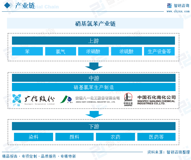 按不同生产方式,硝化工艺可分为以下3类:1)间歇硝化工艺:所有物料一次性加入设备中,完成操作的工艺。间歇硝化工艺采用的设备一般为搅拌釜式反应器。2)半间歇硝化工艺:打底物料一次性加入设备中,其余物料分段或持续加入设备中完成操作的工艺。半间歇硝化工艺采用的设备一般为搅拌釜式反应器。3)连续硝化工艺:原料连续进入设备且产品连续排出的工艺。连续硝化工艺的设备可采用搅拌釜式反应器、管式反应器、微通道反应器等。硝基氯苯传统的生产方式多为间歇釜式生产,经氯苯混酸硝化得到,产物硝基氯苯的邻对位产物含量相对固定(约为0.5)。从产业链来看,上游为苯、氯气、浓硝酸、浓硫酸等原材料及生产设备,中游硝基氯苯生产制造,下游为硝基氯苯应用领域,硝基氯苯是生产染料、颜料、农药(如除草剂)和医药的重要原料。