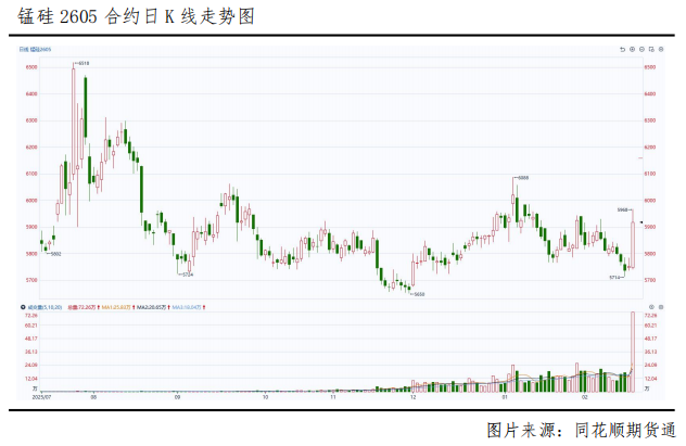 周四,锰硅期货主力合约在支撑位附近大幅上涨,同时伴随成交量明显放大。截至2026年2月26日下午收盘,锰硅2605合约报收5918元/吨,较前一交易日结算价上涨164元/吨,涨幅2.85%。盘面放量回升的主要驱动因素是什么?本轮上涨属于阶段性反弹还是趋势性反转?