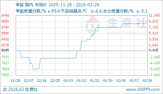 据生意社监测,苯胺02月26日最新价格8920.00元/吨,最近60天上涨12.27%。