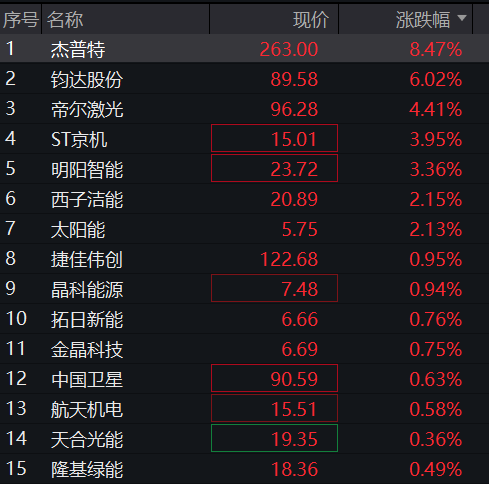 早盘太空光伏概念反弹,钧达股份涨停,珈伟新能、聚和材料、亿晶光电、东方日升、帝科股份跟涨。