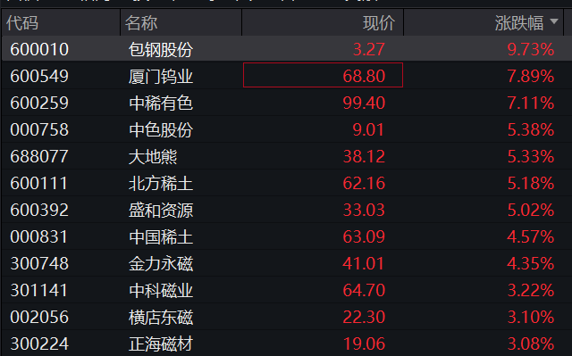 稀土永磁概念走强,包钢股份触及涨停,中稀有色、大地熊、盛和资源、北方稀土、银河磁体、天河磁体跟涨。