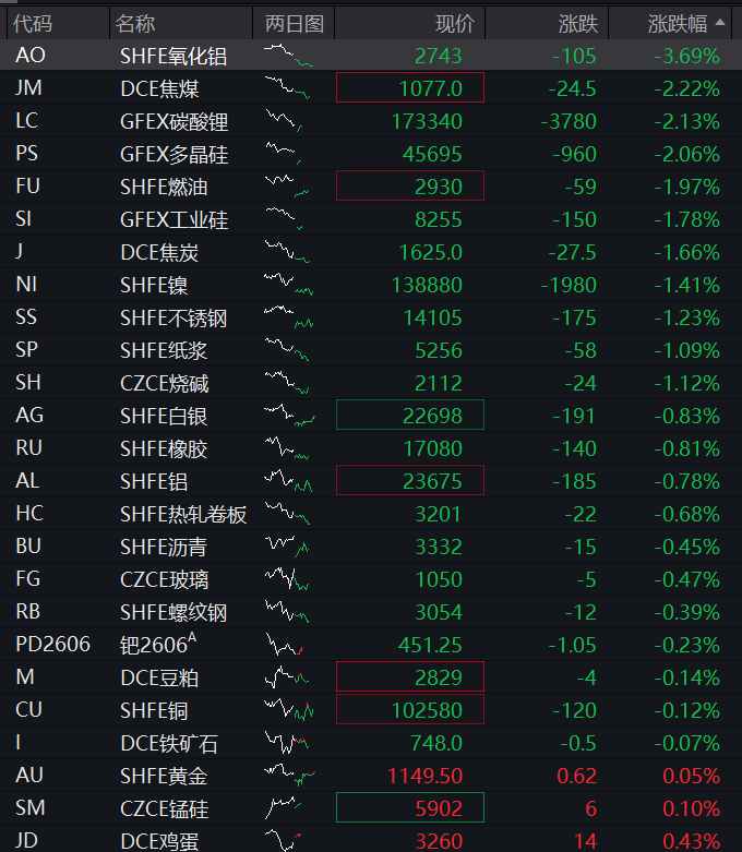 商品:国内商品期货大面积下跌,截至发稿,氧化铝跌超3%,焦煤、碳酸锂、多晶硅跌超2%,燃油、工业硅、焦炭、沪镍、不锈钢、纸浆、烧碱跌超1%,沪银、橡胶、沪铝、热轧卷板等纷纷下跌。