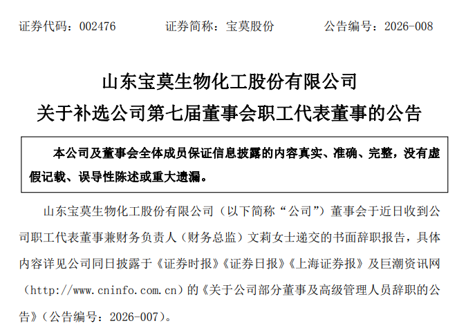 经济导报记者 石潇懿2月25日,宝莫股份(002476.SZ)发布公告,宣布包括董事长陶旭城在内的多名核心董事及高级管理人员集体辞职。同时,公司已完成第七届董事会职工代表董事补选,总经理李鼎当选新任职工代表董事。