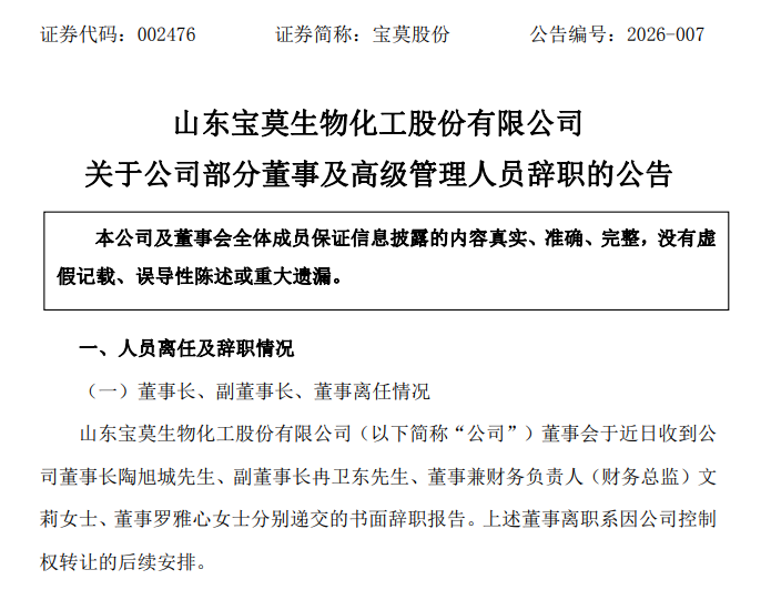 公告显示,宝莫股份董事会近日陆续收到董事长陶旭城、副董事长冉卫东、职工代表董事兼财务负责人文莉、董事罗雅心四人的书面辞职报告,四人辞职原因均明确为“公司控制权转让后续安排”。截至公告披露日,上述离任董事均未持有公司股份。