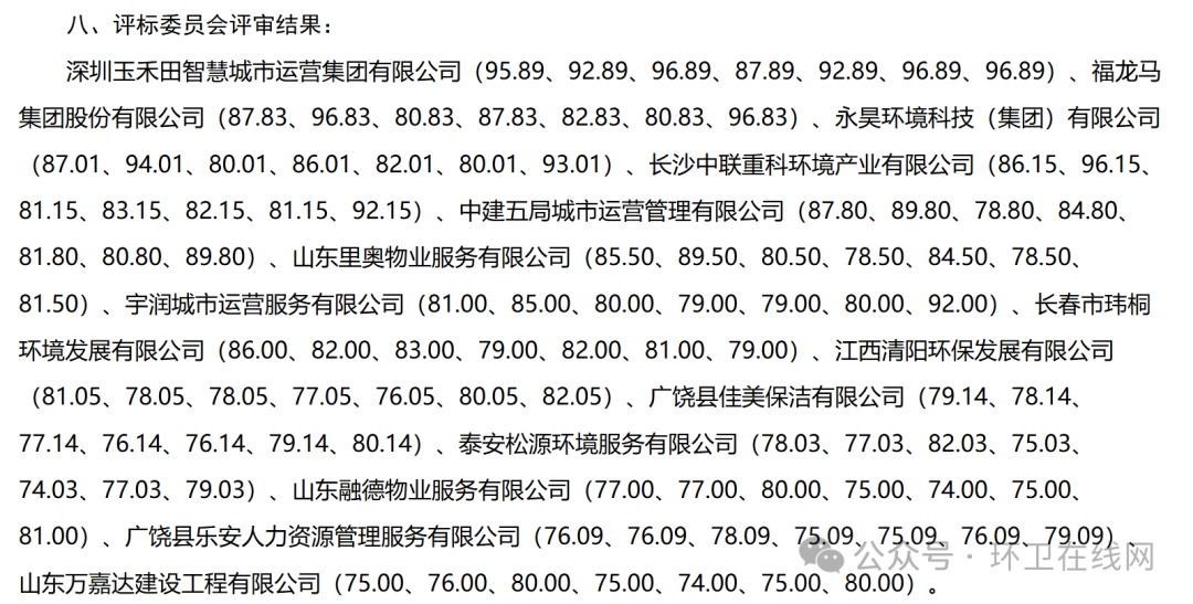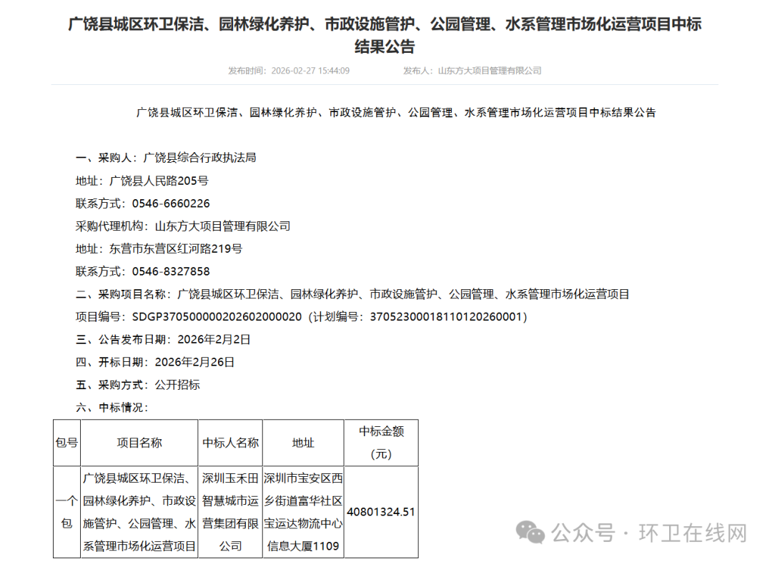 环卫在线网讯,2026年2月27日,经深圳玉禾田、福龙马集团股份有限公司、长沙中联重科环境产业有限公司、中建五局城市运营管理有限公司、永昊环境科技(集团)有限公司等14家企业激烈角逐,广饶县城区环卫保洁、园林绿化养护、市政设施管护、公园管理、水系管理市场化运营项目最终结果出炉。玉禾田集团旗下深圳玉禾田智慧城市运营集团有限公司凭借突出的综合实力、完善的全场景服务方案与优异的历史履约表现,从一众竞标企业中脱颖而出,成功中标本项目,中标金额约4080.13万元。
