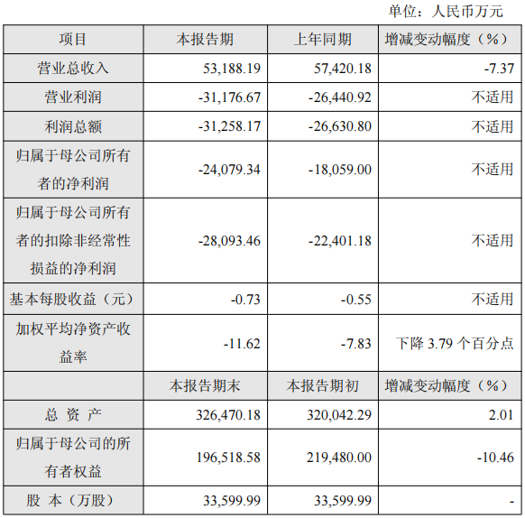 根据公告,2025年公司预计实现营业总收入53,188.19万元,较上年同期下降7.37%;实现归属于母公司所有者的净利润-24,079.34万元,亏损同比增加6,020.34万元;实现归属于母公司所有者的扣除非经常性损益的净利润-28,093.46万元,亏损同比增加5,692.29万元。基本每股收益为-0.73元。