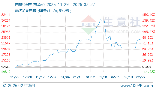 据生意社监测,白银02月27日最新价格22994.67元/千克,最近5天上涨15.24%,60天上涨19.85%。
