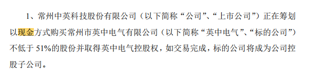 据悉,公司拟以现金方式收购常州市英中电气有限公司(以下简称“英中电气”)不低于51%的股权,从而取得其控股权。