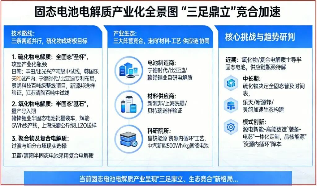 当前固态电池电解质产业呈现“三足鼎立、生态竞合”新格局:硫化物路线由中日韩企业领跑攻坚工程化瓶颈;氧化物路线率先在半固态市场实现装车验证;聚合物复合路线则以兼容性承接产业过渡需求。