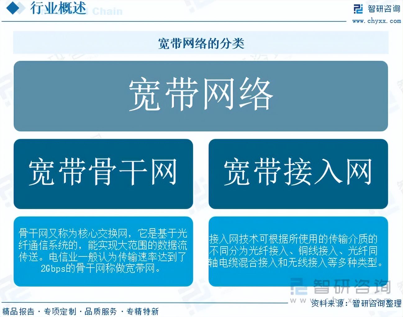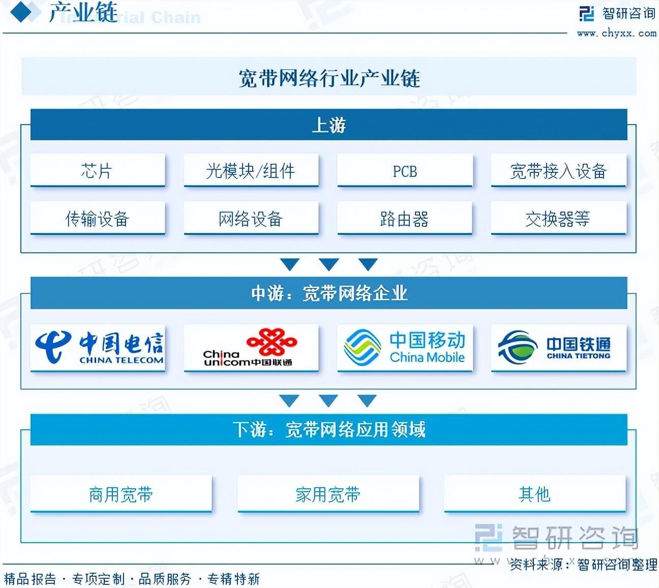 宽带网络产业链上游为原材料和设备供应,包括芯片、光模块/组件、PCB、宽带接入设备、传输设备、网络设备、路由器、交换器、防火墙、安全设备、光纤光缆、光缆接头盒、光纤收发器等。产业链中游为宽带网络的建设与运营环节,包括宽带网络的规划、设计、施工、调试等环节。产业链下游为宽带网络的应用,包括商用宽带、家用宽带等。