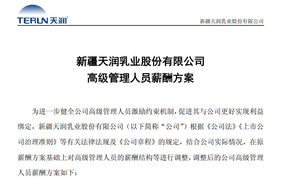 近日,天润乳业发布公告称,为进一步健全公司高级管理人员激励约束机制,促进其与公司更好实现利益绑定,根据《公司法》《上市公司治理准则》等有关法律法规及《公司章程》的规定,结合公司实际情况,在原薪酬方案基础上对高级管理人员的薪酬结构等进行调整,调整后的薪酬方案从2026年1月1日开始执行。