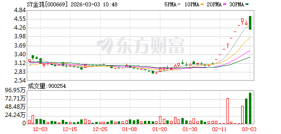 ST金鸿上演“天地板”行情,股价从涨停到跌停,截至10:15,该股成交量8354.79万股,成交额3.75亿元,振幅达9.98%,换手率12.28%,跌停板封单金额为178.83万元。