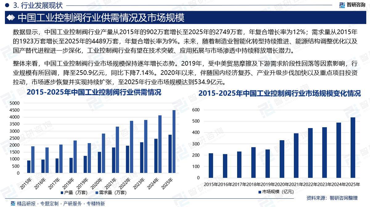 工业控制阀是一种用于调节流体(如气体、液体、蒸汽或浆液)流量、压力、温度或液位的装置。通过调节阀芯、阀座、阀门的开度,工业控制阀可以控制流体的流动路径,从而达到精确控制过程参数的目的。工业控制阀是工业领域应用的控制阀,区别于家用控制阀产品。按功能,有调节阀和开关阀,按行程特点,有直行程和角行程,按其所配执行机构使用的动力,可分为气动、电动、液动、电液联动、气液联动,此外还有按压力范围、温度范围等分类情况。控制阀作为工业流程中的关键组件,广泛应用于石油、天然气、电力、化工、水处理等多个领域,承担着调控流体流量、压力与温度等重要功能。随着全球范围内发展中国家工业化进程持续加快,工业自动化水平不断提升,工业控制阀的市场需求也随之稳步增长。同时,物联网、工业4.0等新技术的融合应用,推动了工业控制阀向智能化、网络化方向演进,使其在效率、精度与可维护性方面显著增强,进一步拓展了其在高端制造与智慧工厂中的应用场景。数据显示,全球工业控制阀行业市场规模从2015年的182.9亿美元增长至2025年的249亿美元,年复合增长率为3.13%。未来,随着全球工业结构持续升级、绿色制造与节能改造需求日益突出,以及智能传感、预测性维护等技术在控制阀领域的深度融合,行业将朝着更高可靠性、更强适应性及全生命周期服务的方向发展,市场规模有望继续保持稳步扩张。目前,中国工业控制阀行业总体上供需相对平衡。随着中国制造业的不断发展和技术创新,制造商的产能得到提升,供给相对充足。与此同时,工业化进程、环保要求和自动化需求等因素推动了对工业控制阀的需求增长。数据显示,中国工业控制阀行业产量从2015年的902万套增长至2025年的2749万套,年复合增长率为12%;需求量从2015年的1923万套增长至2025年的4489万套,年复合增长率为9%。未来,随着制造业智能化转型持续推进、能源结构调整优化以及国产替代进程进一步深化,工业控制阀行业有望在技术突破、应用拓展与市场渗透中持续释放增长潜力。随着中国经济的稳步增长,作为全球最大的制造业国家,其工业控制阀市场规模持续扩大。国内多元化的工业领域,包括石油与天然气、化工、电力、食品饮料等行业,均对工业控制阀存在持续且庞大的需求。与此同时,中国政府推动的基础设施建设与工业现代化战略,如“新基建”等政策,进一步为工业控制阀市场注入了增长动力。整体来看,中国工业控制阀行业市场规模保持逐年增长态势。2019年,受中美贸易摩擦及下游需求阶段性回落等因素影响,行业规模有所回调,降至250.9亿元,同比下降7.14%。2020年以来,伴随国内经济复苏、产业升级步伐加快以及重点项目投资拉动,市场逐步恢复并实现持续扩张,至2025年行业市场规模达到534.9亿元。展望未来,随着国内经济持续发展与工业化进程深入推进,工业控制阀的市场需求有望进一步增长。中国工业控制阀行业已形成外资主导高端、本土企业多层级竞争的格局。以美国费希尔、美国福斯、德国萨姆森、日本工装、芬兰美卓等为代表的国际品牌凭借雄厚的技术积累、资金优势和丰富的行业经验,长期占据高端市场的主导地位。国内企业如江苏神通、纽威股份、吴忠仪表、浙江力诺、重庆川仪调节阀、智能自控、斯考尔、永盛科技等本土厂商,通过持续技术研发和成本控制,在中低端及部分细分应用领域建立起较强竞争力,并逐步向高端市场渗透。整体来看,工业控制阀行业企业数量众多,竞争日趋激烈,呈现出外资品牌技术引领、本土企业追赶升级、市场结构逐步优化的竞争态势。