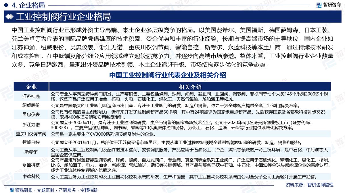 企业格局:中国工业控制阀行业已形成外资主导高端、本土企业多层级竞争的格局。以美国费希尔、美国福斯、德国萨姆森、日本工装、芬兰美卓等为代表的国际品牌凭借雄厚的技术积累、资金优势和丰富的行业经验,长期占据高端市场的主导地位。国内企业如江苏神通、纽威股份、吴忠仪表、浙江力诺、重庆川仪调节阀、智能自控、斯考尔、永盛科技等本土厂商,通过持续技术研发和成本控制,在中低端及部分细分应用领域建立起较强竞争力,并逐步向高端市场渗透。整体来看,工业控制阀行业企业数量众多,竞争日趋激烈,呈现出外资品牌技术引领、本土企业追赶升级、市场结构逐步优化的竞争态势。