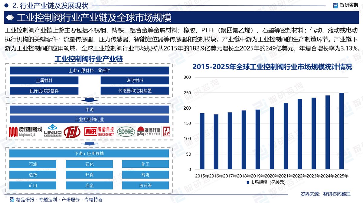 全球市场规模:控制阀作为工业流程中的关键组件,广泛应用于石油、天然气、电力、化工、水处理等多个领域,承担着调控流体流量、压力与温度等重要功能。随着全球范围内发展中国家工业化进程持续加快,工业自动化水平不断提升,工业控制阀的市场需求也随之稳步增长。同时,物联网、工业4.0等新技术的融合应用,推动了工业控制阀向智能化、网络化方向演进,使其在效率、精度与可维护性方面显著增强,进一步拓展了其在高端制造与智慧工厂中的应用场景。数据显示,全球工业控制阀行业市场规模从2015年的182.9亿美元增长至2025年的249亿美元,年复合增长率为3.13%。未来,随着全球工业结构持续升级、绿色制造与节能改造需求日益突出,以及智能传感、预测性维护等技术在控制阀领域的深度融合,行业将朝着更高可靠性、更强适应性及全生命周期服务的方向发展,市场规模有望继续保持稳步扩张。