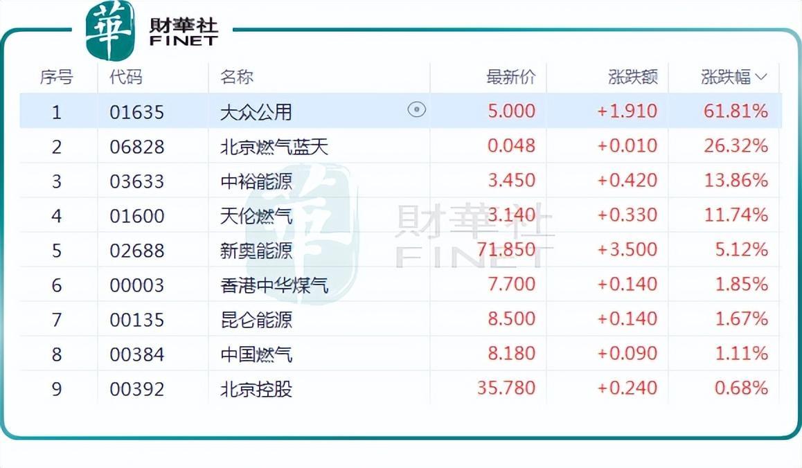 在港股,截至收盘,$大众公用(HK1635)大涨61.81%,$北京燃气蓝天(HK6828)涨26.32%,$中裕能源(HK3633)涨13.86%,天伦燃气(01600.HK)涨11.74%,新奥能源(02688.HK)涨5.12%,昆仑能源(00135.HK)、中国燃气(00384.HK)等亦上行。