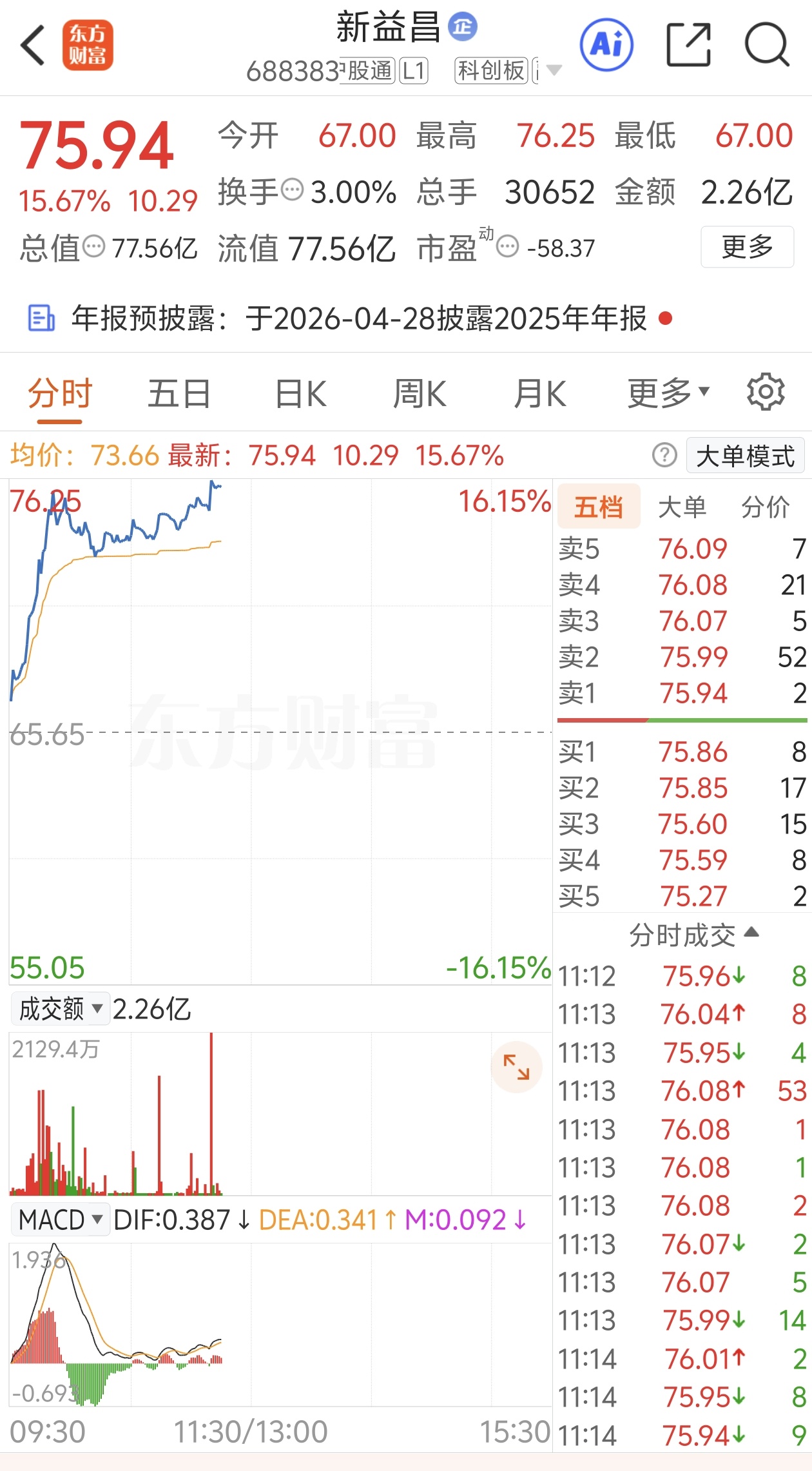 上证报中国证券网讯(记者 杨子晏)3月5日,新益昌盘中涨超15%,截至11时14分,该股报75.94元/股,涨15.67%。同日,Micro LED概念股走强,华灿光电、聚飞光电、雷曼光电等多股涨停。