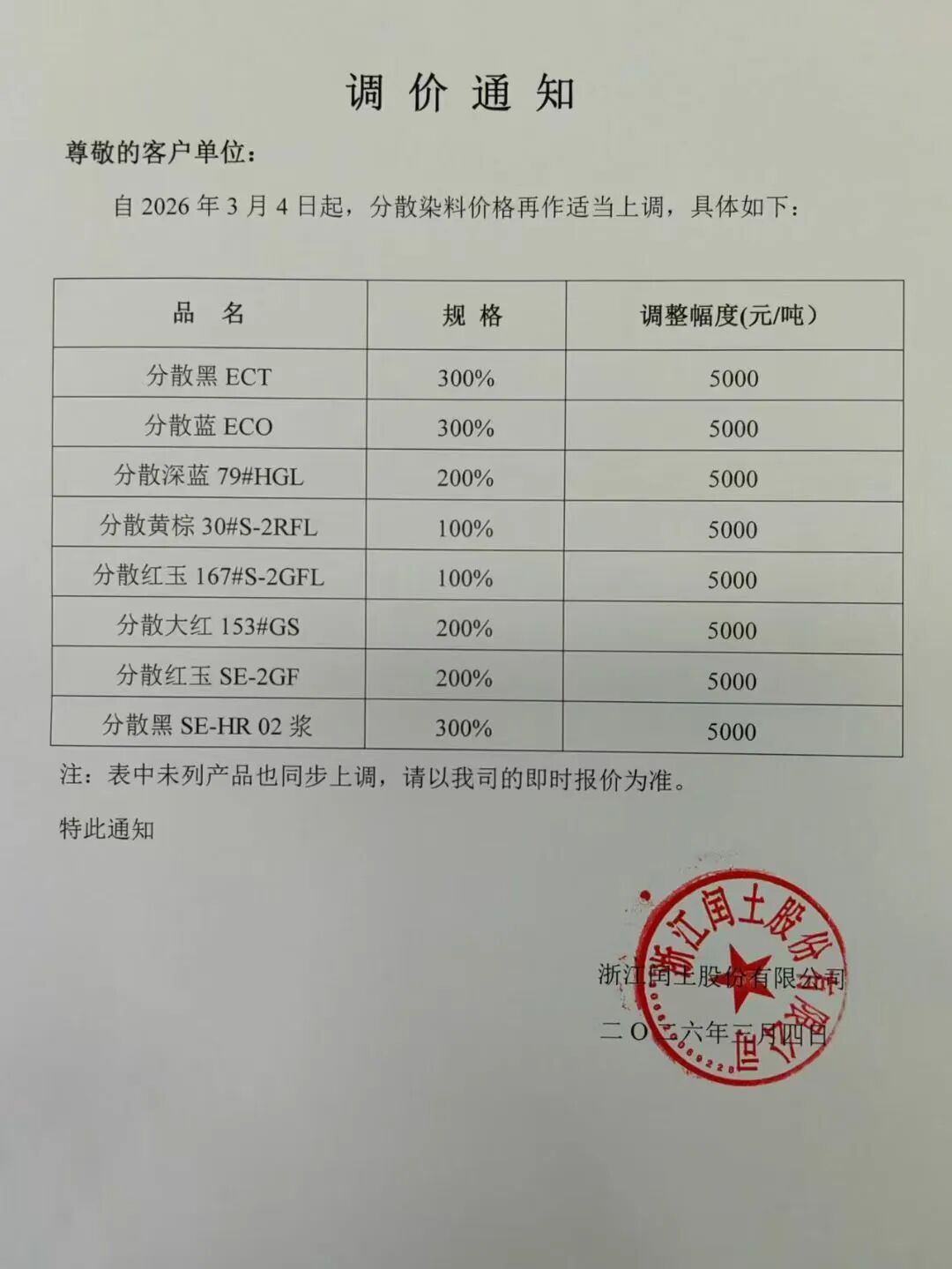 3月4日,全球染料龙头浙江龙盛发布涨价函,对分散染料产品实施新一轮调价,涨价幅度为5000元/吨。