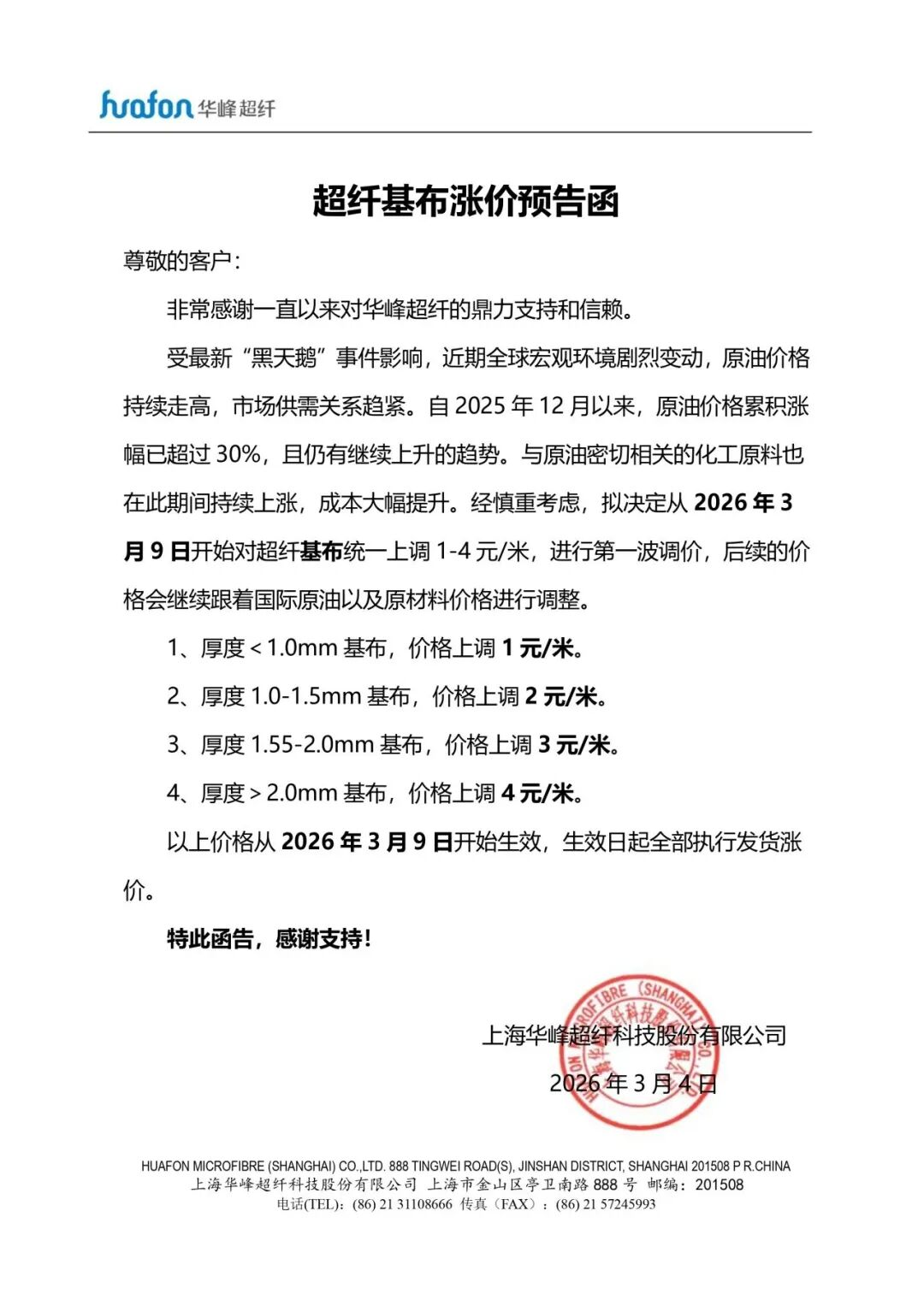 3月4日,华峰超纤也发布了超纤基布涨价预告,表示自2025年12月以来,原油价格累积涨幅已超过30%,且仍有继续上升的趋势,自家产品成本飙升,拟决定从2026年3月9日开始对超纤基布统一上调1-4元/米,进行第一波调价。