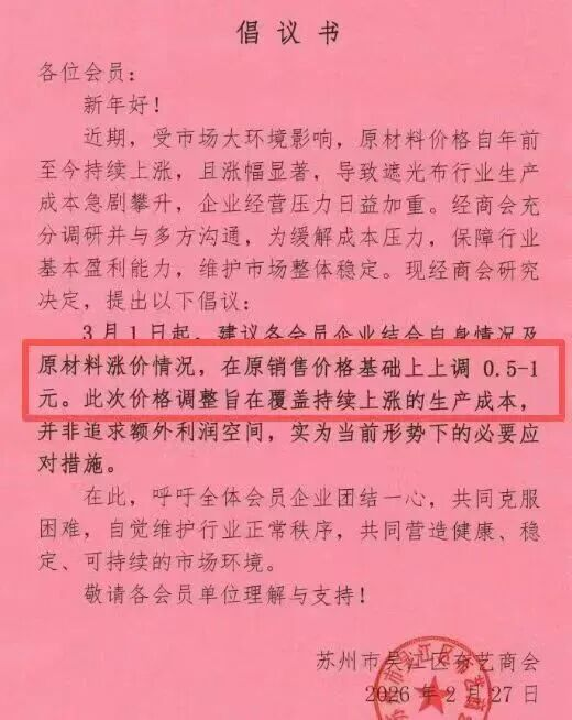2月27日,苏州吴江布艺协会发布涨价倡议书,由于不可抗力造成的成本上涨,自3月1日起,建议各企业结合自身情况及原材料涨价幅度,在原销售价格基础上上调0.5-1元/米(或相应单位)。