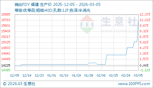 据生意社监测,锦纶FDY03月05日最新价格15825.00元/吨,最近5天上涨6.57%,10天上涨8.39%,30天上涨10.86%。