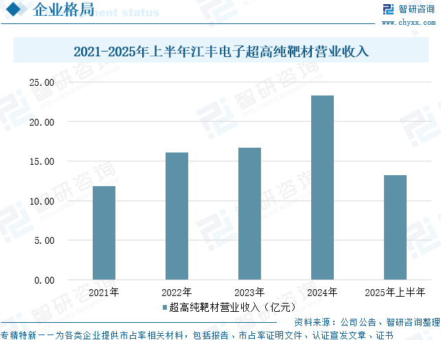 宁波江丰电子材料股份有限公司主要专注于超高纯金属溅射靶材、半导体精密零部件的研发、生产和销售,其中超高纯金属溅射靶材包括铝靶、钛靶、钽靶、铜靶以及各种超高纯金属合金靶材等,这些产品主要应用于超大规模集成电路芯片、平板显示器的物理气相沉积(PVD)工艺,用于制备电子薄膜材料。半导体精密零部件包括金属、陶瓷、树脂等多种材料经复杂工艺加工而成的精密零部件,主要用于半导体芯片以及平板显示器生产线的机台,覆盖了包括PVD、CVD、刻蚀、离子注入以及产业机器人等应用领域,其生产过程对于材料精密制造技术、表面处理特种工艺等技术要求极高,产品主要出售给晶圆制造商作为设备使用耗材或出售给设备制造商用于设备生产。在超高纯金属溅射靶材领域,公司主要生产超高纯金属溅射靶材,包括超高纯铝靶材、超高纯钛靶材及环件、超高纯钽靶材及环件、超高纯铜靶材及环件、钨钛靶、镍靶和钨靶等。其中,超高纯铜靶材及铜锰、铜铝合金靶材是目前使用最为广泛的先端半导体导电层薄膜材料之一。在其应用领域中,超大规模集成电路芯片的制造对溅射靶材金属纯度的要求最高,通常要求达到99.9999%(6N)以上,平板显示器用铜靶的金属纯度略低,分别要求达到99.999%(5N)、99.995%(4N5)以上。铜及铜合金作为导电层通常用于90-3nm技术节点的先端芯片中。特别是铜锰合金靶材制造难度高,目前只有江丰电子及头部跨国企业掌握了生产此产品的核心技术。近年来随着高端芯片需求的增长,铜锰合金靶材的需求大幅增长,全球供应链极其紧张。公司生产的铜及铜合金靶材主要用于超大规模集成电路芯片、平板显示器制造领域。据统计,2025年上半年,江丰电子超高纯靶材营业收入为13.25亿元,同比增长23.95%。